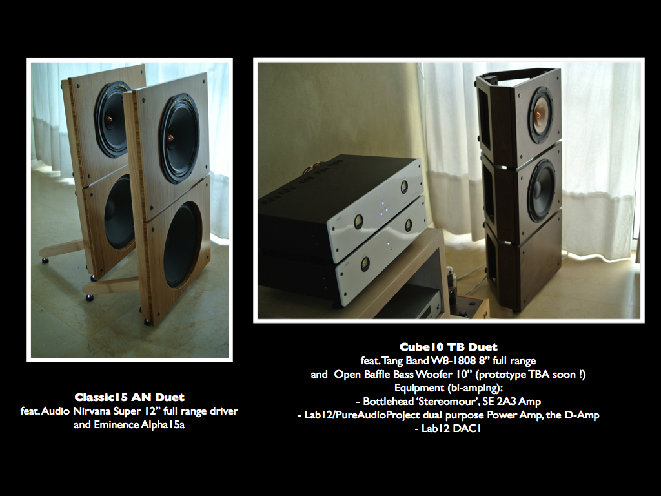 www.pureaudioproject.comבהשמעה שלנו ניגן ה- 'Classic15 AN Duet' שמשלב את 'Audio Nirvana Super 12' ו- 'Eminence Alpha15a', בהגברת bi-amping עם מגבר שפופרת SE 2A3 3.5w ומגבר הספק Class-D ייעודי שלנו, D-Amp180, המבוסס על UcD 180HG+HR Hypex.